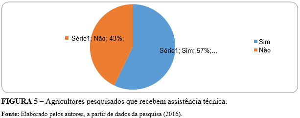 Considerando que a assistência técnica é essencial para o desenvolvimento das atividades agrárias tendo papel fundamental na implantação de técnicas e tecnologias produtivas, esse trabalho buscou verificar se este serviço está ao alcance dos agricultores familiares associados da Cresol Ji-paraná tomadores de crédito do Pronaf, porém, essa pesquisa não tem por objetivo aprofundar as informações referentes aos serviços de ATER não permitindo maiores análises sobre esse assunto. A Figura 5 é possível constatar o percentual de agricultores familiares que afirmam receber assistência técnica.