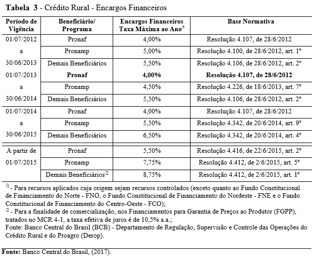 No que se refere aos encargos financeiros (juros) praticados no Programa Nacional de Fortalecimento da Agricultura Familiar (Pronaf), pode-se observar na Tabela 3 que são taxas negativas, se comparada à inflação.