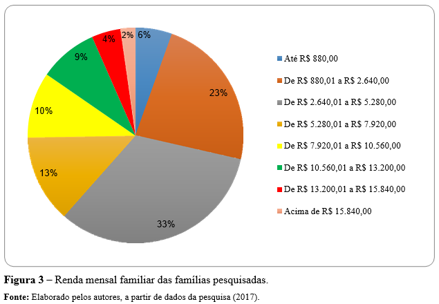 Conforme se observa na Figura 3, a renda mensal familiar dos agricultores familiares que foram objetos da pesquisa é, na sua grande maioria, até 06 salários mínimos, tendo 05 famílias com renda até um salário mínimo, 21possui renda entre um a três salários mínimos e 30 entre três a seis salários mínimos.