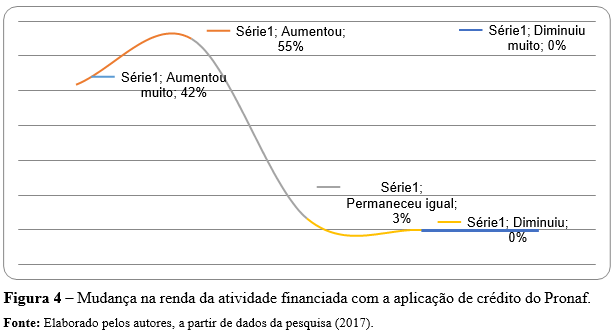 Conforme se observa na Figura 4, esse objetivo se consolida já que 88 pessoas disseram que a renda da atividade financiada pelo Pronaf aumentou ou aumentou muito e apenas 03 pessoas disseram que a renda permaneceu igual. Nenhum entrevistado considera que sua renda diminuiu após a aplicação dos recursos do Pronaf financiado pela Cresol Ji-paraná. Para aqueles que mencionaram que não houve variação na renda da atividade, o motivo para 02 entrevistados foi à falta de acompanhamento e assistência técnica e uma pessoa considerou a dificuldade na comercialização da produção.