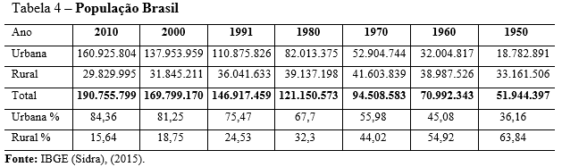 É possível observar na Tabela 4 a forte desruralização ocorrida no Brasil ao longo dos anos. Até a década de 1960 a população rural era maior do que a população urbana tendo invertido na década de 1970 mesmo sendo o período com maior número de pessoas vivendo na zona rural no Brasil, chegando ao seu auge com mais de 41 milhões.