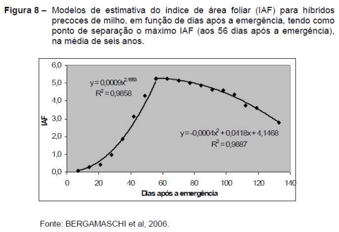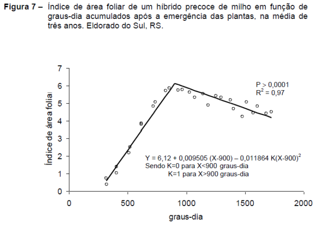 Baseado no modelo segmentado de Brisson et al. (1990), Müller et al. (2005) observaram que o crescimento do IAF do milho é linear entre o estádio de quatro folhas expandidas e o final da expansão da folha bandeira, que corresponde à antese.