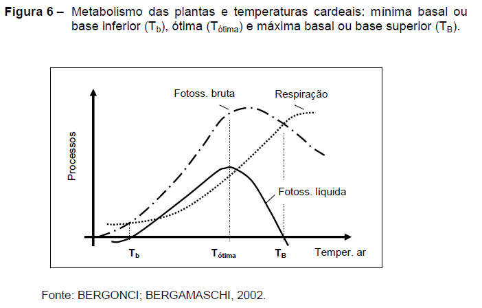 A Figura 6 demonstra, de uma forma genérica, como a temperatura influencia o metabolismo básico das plantas (BERGONCI; BERGAMASCHI, 2002). A fotossíntese líquida (assimilação líquida) tem aumento acentuado em baixas temperaturas, ocasionado por incrementos diferenciados nos processos de fotossíntese e respiração, atingindo um máximo na chamada temperatura ótima.