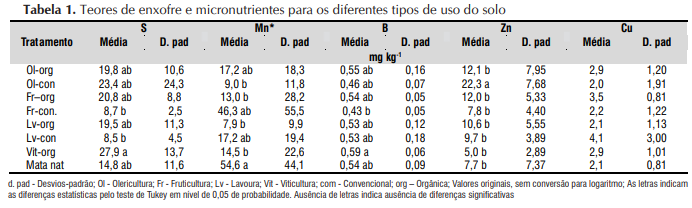 As diferenças significativas para o enxofre (S) indicam maior aporte no uso com viticultura levando a teores que excedem em cerca de cinco vezes o limite da classe "alto" para teores deste elemento (CFS, 2004). Verificam-se maiores teores de S em sistemas de produção orgânicos, além da olericultura convencional. A utilização deste elemento é bastante associada à viticultura, inclusive por meio de produtos para proteção fitossanitária, entre as quais se destacam as denominadas “caldas de preparo caseiro”, como sulfocálcica ou "bordaleza" (Peruch & Bruna, 2008) podendo ser também o caso do boro (B) cuja viticultura orgânica teve maiores valores. O Mn, por sua vez, apresenta tendência contrária da maior parte dos elementos avaliados com maiores teores nas áreas com mata nativa, apresentando diferenças significativas em relação à viticultura, lavoura e fruticultura em sistemas orgânicos e olerícolas em sistema convencional, provavelmente pela grande adição de nutrientes nesses usos, influenciando o complexo sortivo.