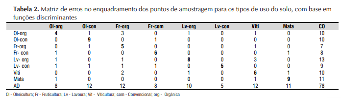 A análise discriminante possibilitou o enquadramento de cada unidade amostral (parcela) em cada tipo de uso, com base na utilização de três funções discriminantes, que corresponderam a 82% da variância acumulada a partir dos 13 atributos avaliados (Tabela 2). Entre as 78 amostras trabalhadas 52 tiveram a classificação pela análise discriminante (AD) coincidente com a classificação original (CO) feita por ocasião da identificação da gleba e da realização da amostragem. Este dado indica exatidão geral de 67%. Os denominados erros de omissão – EO (atribuição de glebas como sendo de outros tratamentos e não como o tratamento original) foram maiores na olericultura orgânica quando apenas 40% das amostras tiveram a classificação por AD coincidente com CO. O índice de Kappa foi de 0,62, considerado bom, evidenciando coincidência entre as classificações por AD e a CO (Figueiredo et al., 2008).