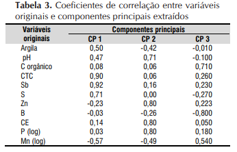 A análise dos componentes principais (CP) foi feita a partir de 11 atributos já que os teores de COP e Cu foram eliminados da análise em razão de apresentarem as menores diferenças entre tratamentos. A análise dos autovalores assumidos pelos componentes principais, com seleção dos que obtiveram valores maiores que 1,0, bem como o percentual da variância representado por esses, permitiu a seleção de 3 CPs, correspondendo a 70% da variância total. A Tabela 3 indica as correlações obtidas entre os CPs e as variáveis originais. O CP 1 está relacionado às características do complexo sortivo (soma de bases e CTC) além do enxofre (S); o CP 2 sinaliza alta correlação com características da solução do solo, como pH e condutividade elétrica, além do fósforo, enquanto o CP 3 apresentou maior correlação com o boro e o carbono orgânico.
