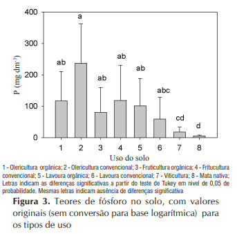 O fósforo (P) apresenta comportamento importante entre as diferentes formas de uso e o manejo do solo devido à sua grande utilização nesses sistemas (Figura 3). Os usos mais intensivos do solo apresentaram, como consequência, teores de P que excedem em quatro a cinco vezes o limite para a classe de teores “muito alta” para este elemento, chegando a dez vezes este limite para olericultura convencional. Destacam-se, neste caso, as grandes concentrações de fósforo nos principais componentes orgânicos utilizados, como cama de frango e esterco bovino, ao contrário de efluentes e materiais residuários (Duarte et al., 2012). A olericultura convencional apresentou os maiores teores de P diferindo dos valores obtidos para viticultura e mata nativa. As características desses solos (originados de basalto, com textura média a argilosa) e o método de extração do P, indicam que este elemento foi adicionado sob formas orgânicas, mas permanece no solo após a mineralização (Novais & Smyth, 1999; Schmitt et al., 2013).