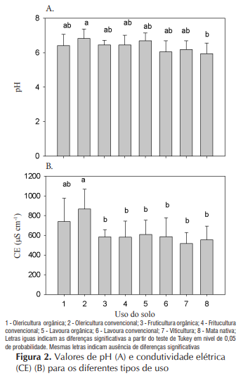 Os maiores valores de pH e condutividade elétrica (CE) foram encontrados na olericultura convencional (Figura 2) na qual as práticas de calagem e adubação mineral e orgânica foram realizadas em maiores quantidades. Em relação ao pH (Figura 2A) as áreas com olericultura convencional apresentaram valores levemente ácidos (Bissani et al., 2008) diferindo da mata nativa e evidenciando os efeitos de uso e manejo.